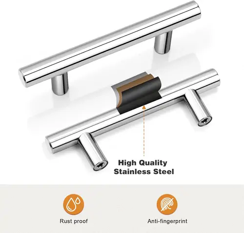 A fogantyúk rozsdamentes acélból készültek, így nemcsak a kiváló megjelenésük garantált, hanem az időtállóságuk is. Az anyagnak köszönhetően ezek a T-alakú fogantyúk nem hajlamosak a rozsdásodásra vagy a korrodálódásra, tehát hosszú éveken keresztül ugyanazt a briliáns fényt és tartósságot biztosítják. Az egyszerű, mégis elegáns dizájnjuk bármilyen stílusú belső térrel harmonizál, legyen az egy vidéki házikó bájával bíró konyha vagy egy minimalista modern nappali.