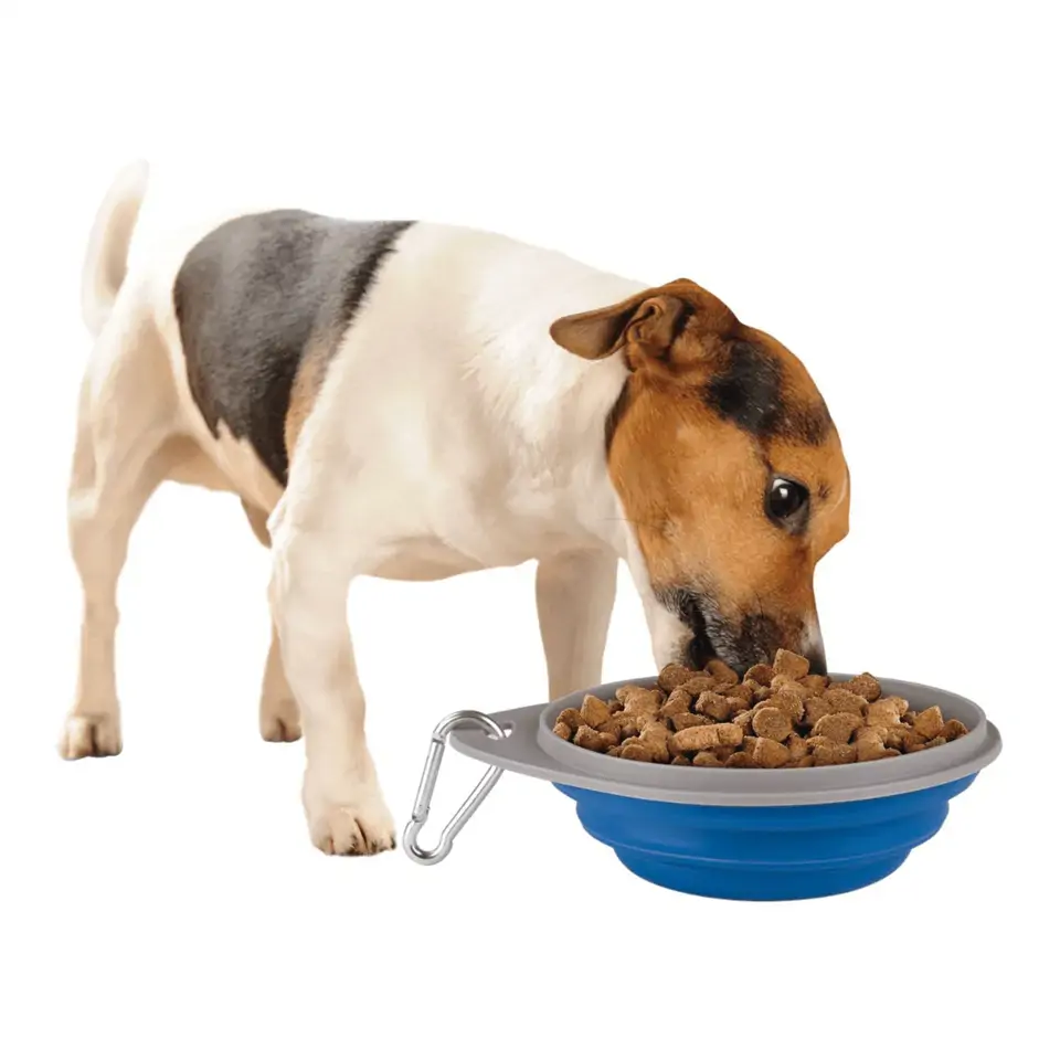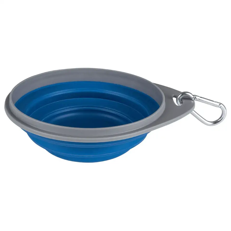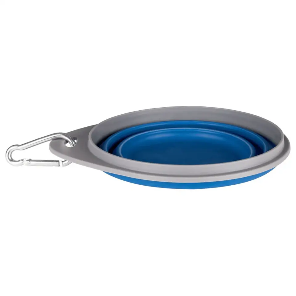 Összehajtható etetőtál: Erős és strapabíró anyagból készült, karabinerrel rögzíthető. Ideális száraz vagy nedves ételekhez, mosogatógépben mosható, így a tisztítás sem okoz gondot.