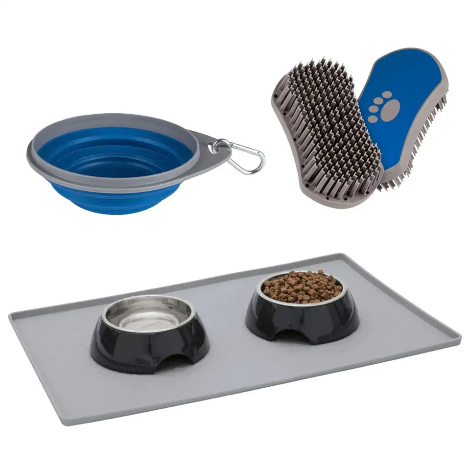 A csomag három kulcsfontosságú terméket tartalmaz, melyek megkönnyítik a gazdik napi életét. A Zoofari Feeding Mat egy szilikonból készült etető alátét, amely gondoskodik arról, hogy az étkezés során kifolyt víz és étel ne szennyezze be a padlót. A szőrszedő kefe szintén a csomag része, amely a V-alakú sörtéknek köszönhetően könnyedén távolítja el a kedvenced szőrét a szőnyegekről, bútorokról és ruhákról. Végezetül, a Zoofari Travel Bowl egy összehajtható etetőtál, amely kiváló társad lesz utazáskor, hiszen bárhol biztosítja a friss étel és víz lehetőségét kedvencednek.