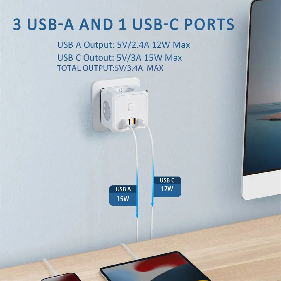 A használat rendkívül egyszerű és intuitív. Csatlakoztasd az elosztót a fali konnektorba, majd dugd be az eszközeidet a megfelelő aljzatokba vagy USB portokba. A 7in1 elosztó kocka intelligens töltési technológiája automatikusan felismeri az eszközöket, és a lehető leggyorsabb töltési sebességet biztosítja. Használata nem igényel különösebb beállítást vagy technikai tudást, csupán csatlakoztatnod kell, és élvezheted a káoszmentes töltés élményét!