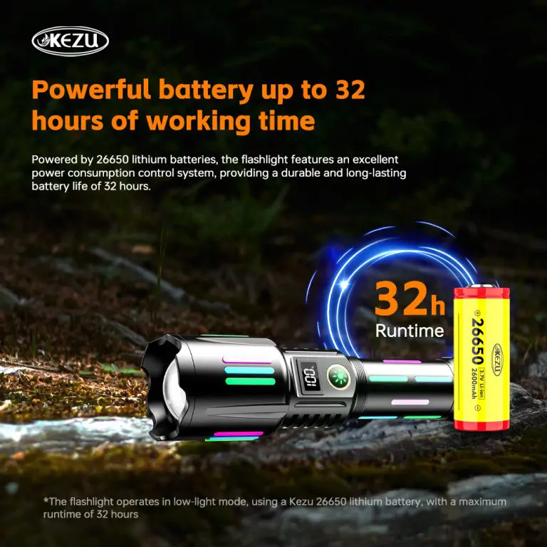 - Újratölthető, nagy kapacitású akkumulátor: A 6000 mAh 26650 Li-ion akkumulátor akár 32 órás üzemidőt biztosít, így hosszabb kalandokra is ideális társad lesz.