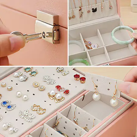 Az Amelia kétszintes ékszerdoboz nem csupán praktikus, de esztétikus is. A rózsaszín PU bőrborítással vonzó megjelenést biztosít a szoba bármely pontján. Az ékszerdoboz klasszikus zárszerkezete és a hozzá tartozó kulcs megakadályozza az illetéktelen hozzáféréseket, így az ékszereid mindig biztonságban lesznek. Továbbá utazásaid során is bátran magaddal viheted, hiszen kis mérete ellenére hatalmas kapacitással rendelkezik, így mindent elhelyezhetsz benne, amire csak szükséged lehet.