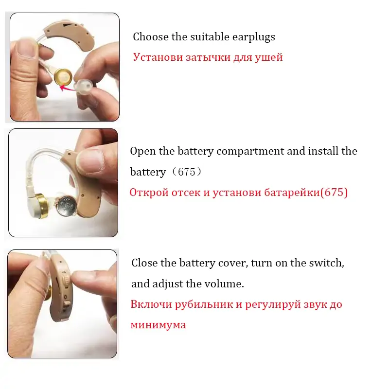 Tartozékok: 1 hallássegítő, 2 db AG13 elem, 2 db szilikon fülbetét, angol nyelvű használati útmutató