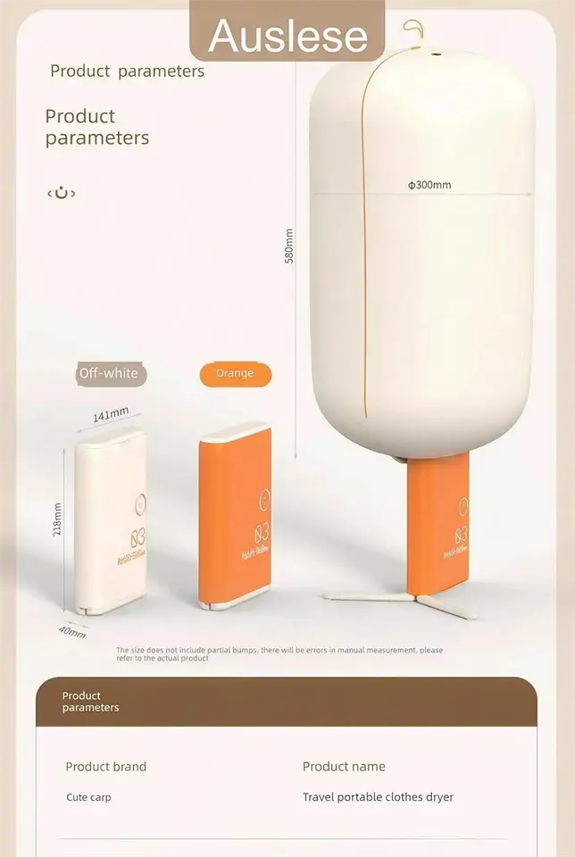 A hordozható mini elektromos ruhaszárító használata pofonegyszerű. Nyisd ki, zipzározd be a ruhákat tartó zsákot, húzd ki a teleszkópos állványt és helyezd a ruhákat a szárító belsejébe. Csatlakoztasd az áramforráshoz, kapcsold be, és máris élvezheted a szárítás kényelmét. Mivel kompakt és könnyen hordozható, ideális választás otthonra és utazásokhoz egyaránt. A hajtogatható kialakítás lehetővé teszi, hogy az eszköz könnyen csomagolható legyen, így bárhová magaddal viheted.