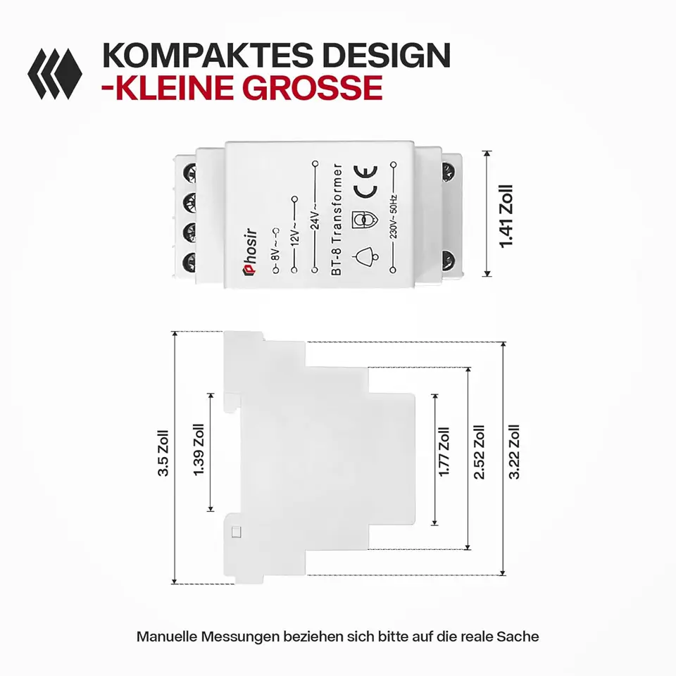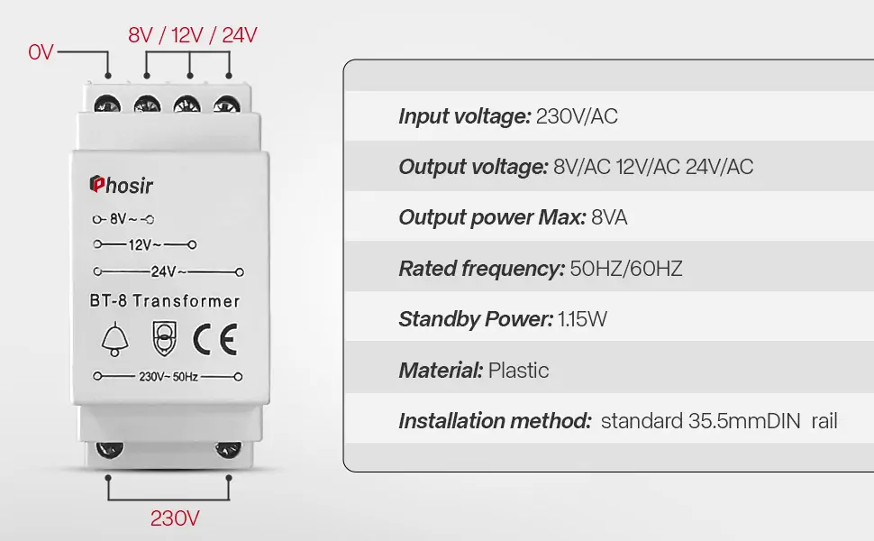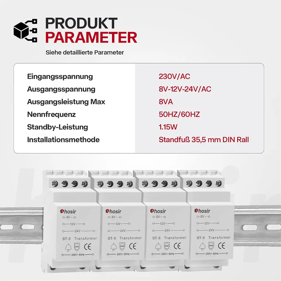 A Phosir BT-8 csengőtrafó igazi megváltás, ha stabil és megbízható feszültséget szeretnél biztosítani eszközeid számára. Az ajtócsengők, elektromos csengők, beléptetőrendszerek és videotelefonok számára ez a csodálatos transzformátor a lehető legjobb választás. Nincs többé váratlan áramkimaradás vagy idegesítő hibák, mert a Phosir BT-8 mindent megtesz, hogy eszközeid folyamatosan működjenek. Kiváló kialakítása egyszerű telepítést tesz lehetővé, miközben hosszú élettartamot is biztosít.