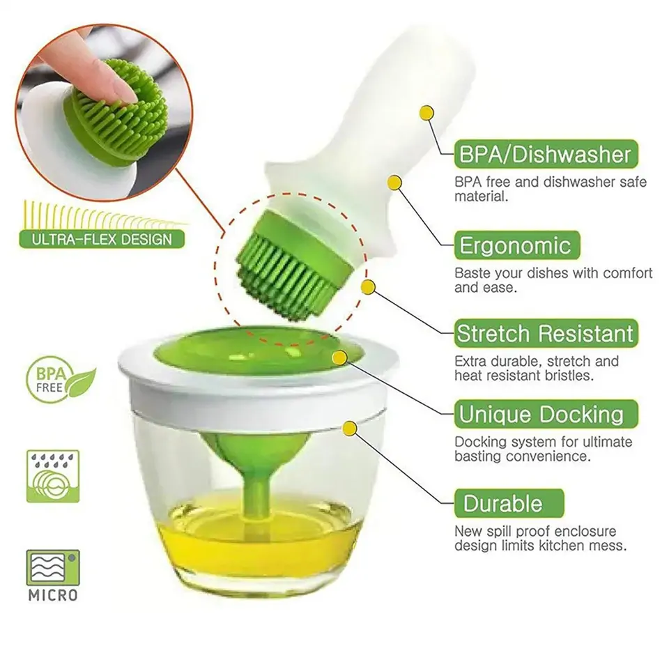 Töltsd meg a tartályt vajjal, olajjal vagy marináddal, majd helyezd be a mikrohullámú sütőbe, hogy az olvadás gyorsan megtörténjen. Dokkold be az ecsetet a tartályba, nyomd meg, hogy magába szívja a folyadékot, és máris kezdheted a kenést süteményeken, húsokon vagy akár a serpenyőben. Mindössze egy mozdulat, és nincs több csepegés vagy pazarlás.