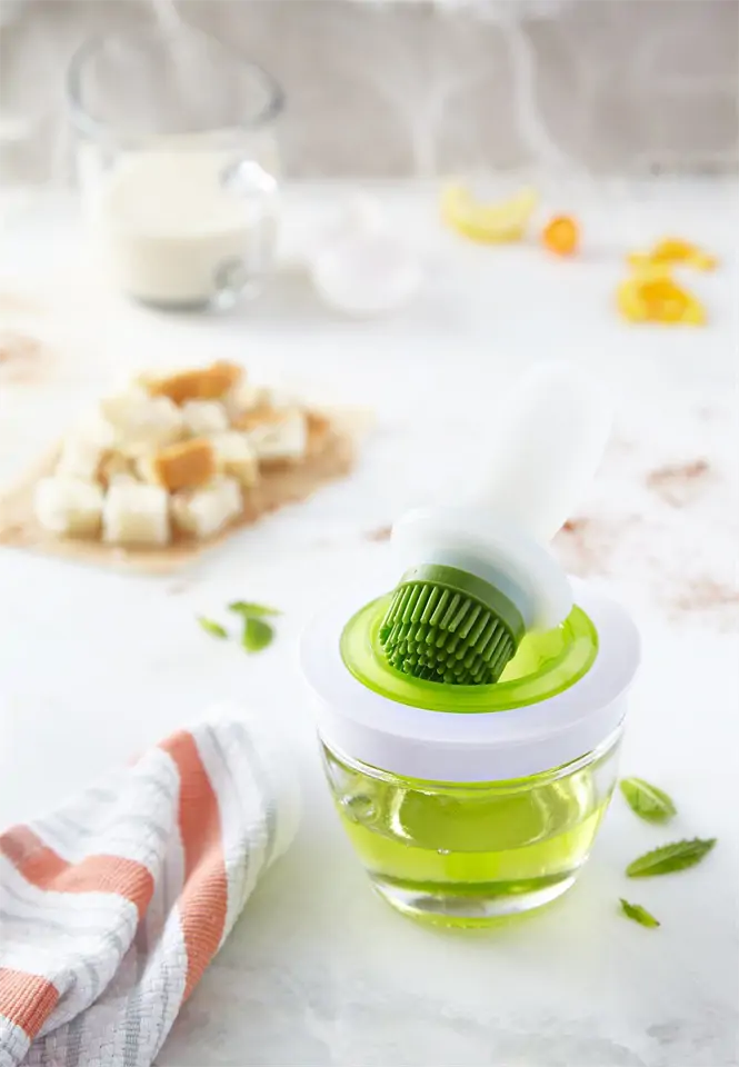 A szilikon kenőszett ecsettel megújítja a konyhai rutinodat, hiszen lehetőséget ad arra, hogy bármilyen főzési, sütési helyzetben állj elébe az adódó kihívásoknak. A hőálló szilikon anyagból készült ecset és mikrohullámú sütőben használható üvegtál kombinációja garantálja, hogy bármilyen folyadékot gyorsan és egyszerűen adagolhass. Az egyedi dokkolórendszernek köszönhetően a konyhai eszköz mindig kéznél van, nem gurul el, nem esik szét, így időt és energiát takaríthatsz meg.